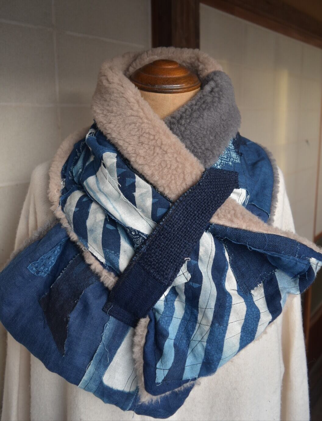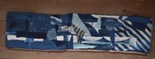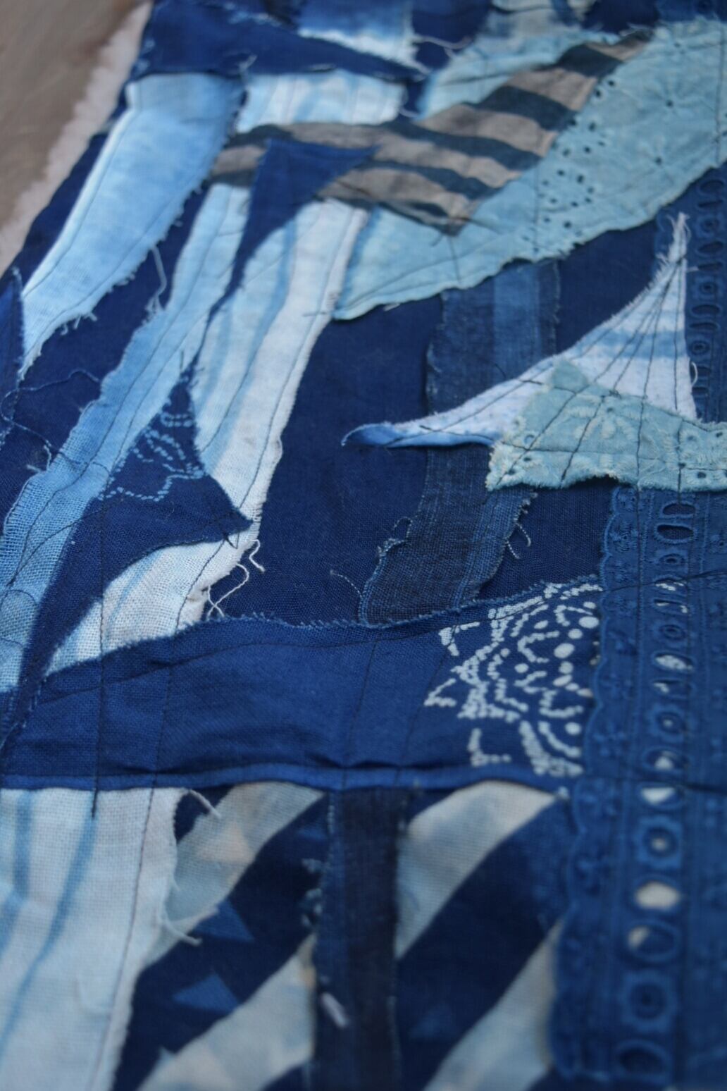 表地には、リネン生地をベースに藍染のかけら達をパッチワークしました○