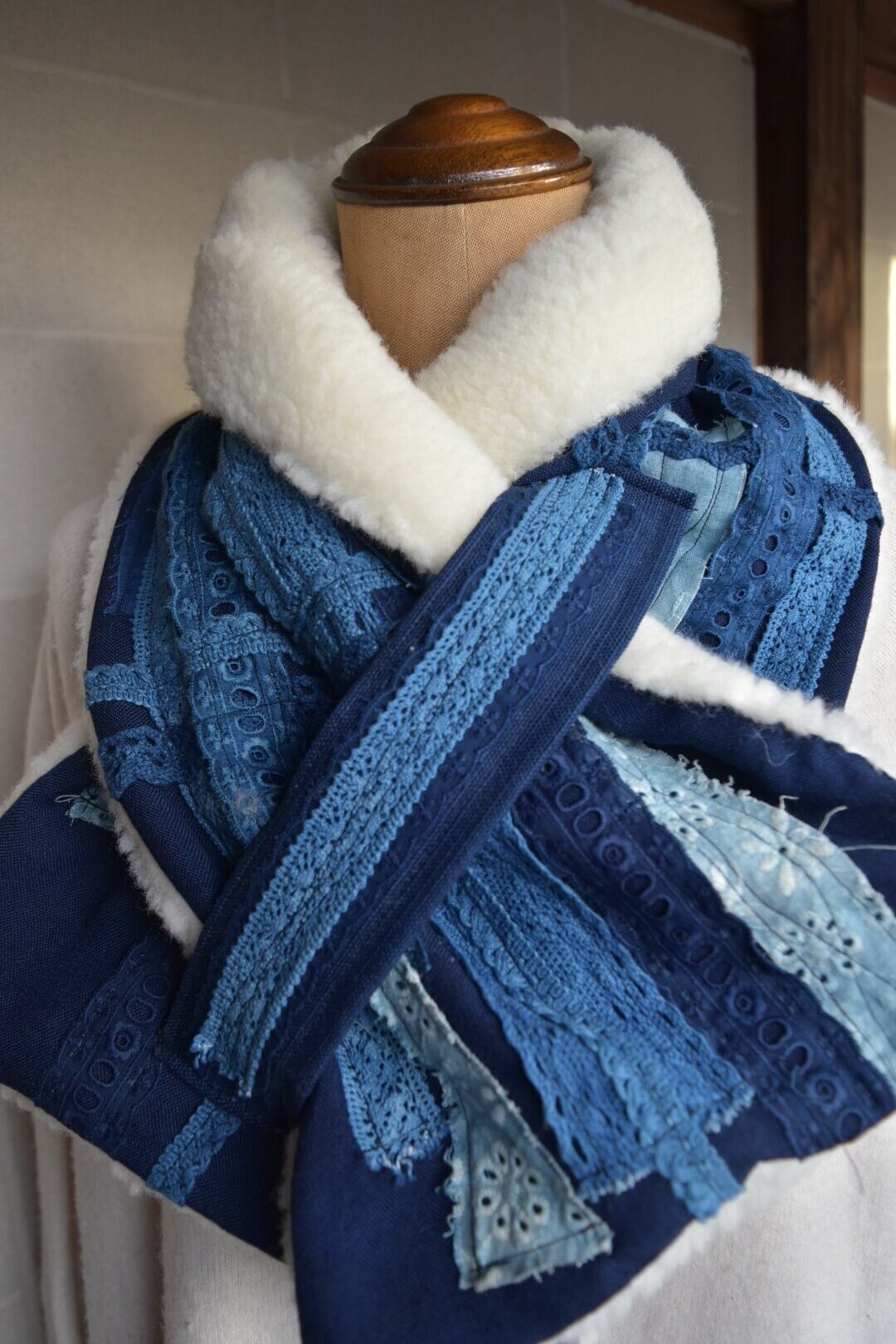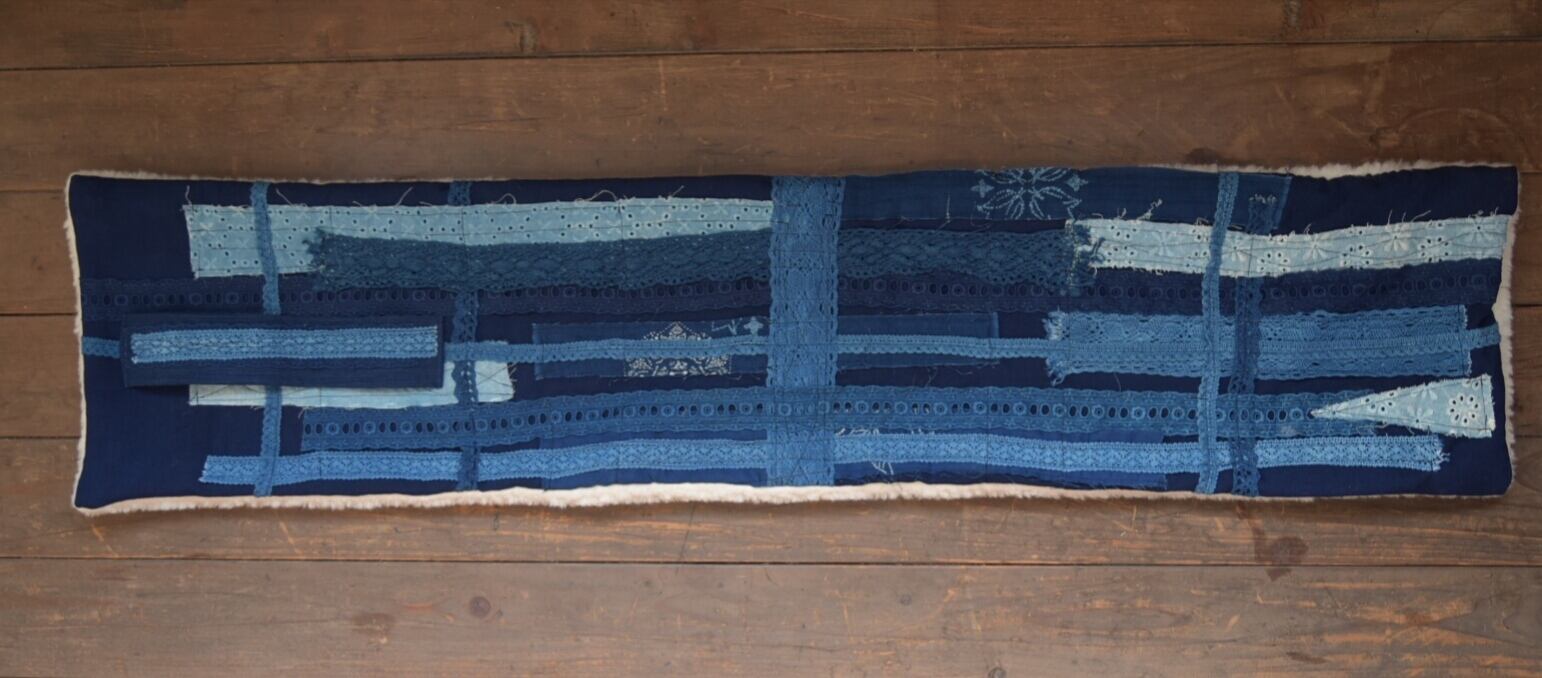 表地には、ウールの生地をベースに様々な濃淡に染め分けたレースや端切れをミシンステッチでパッチワークしました○