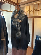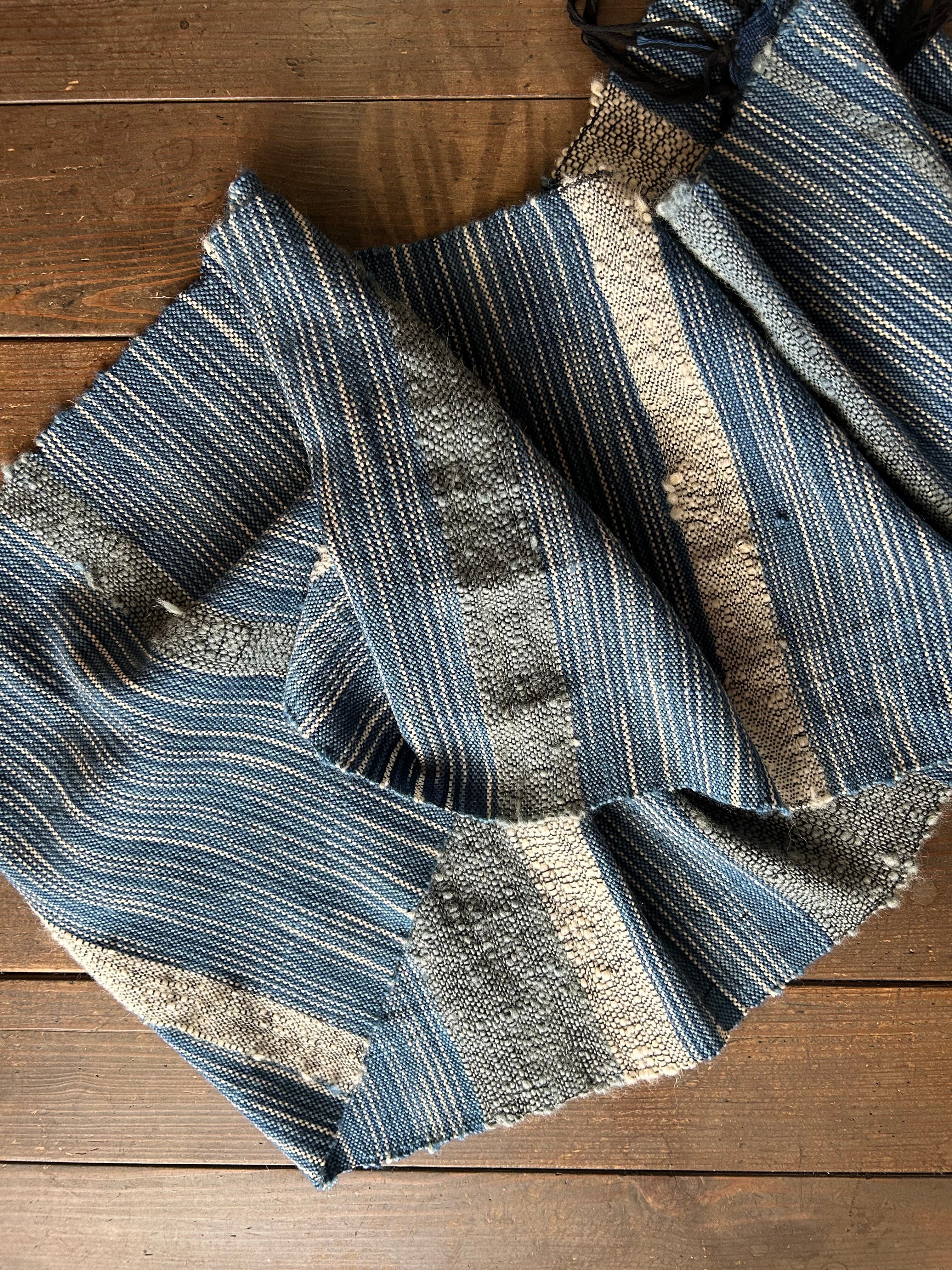 This shawl is hand-woven using wool yarns dyed in a gradation of indigo dye and hand-spun wool yarns dyed with raw indigo leaves.