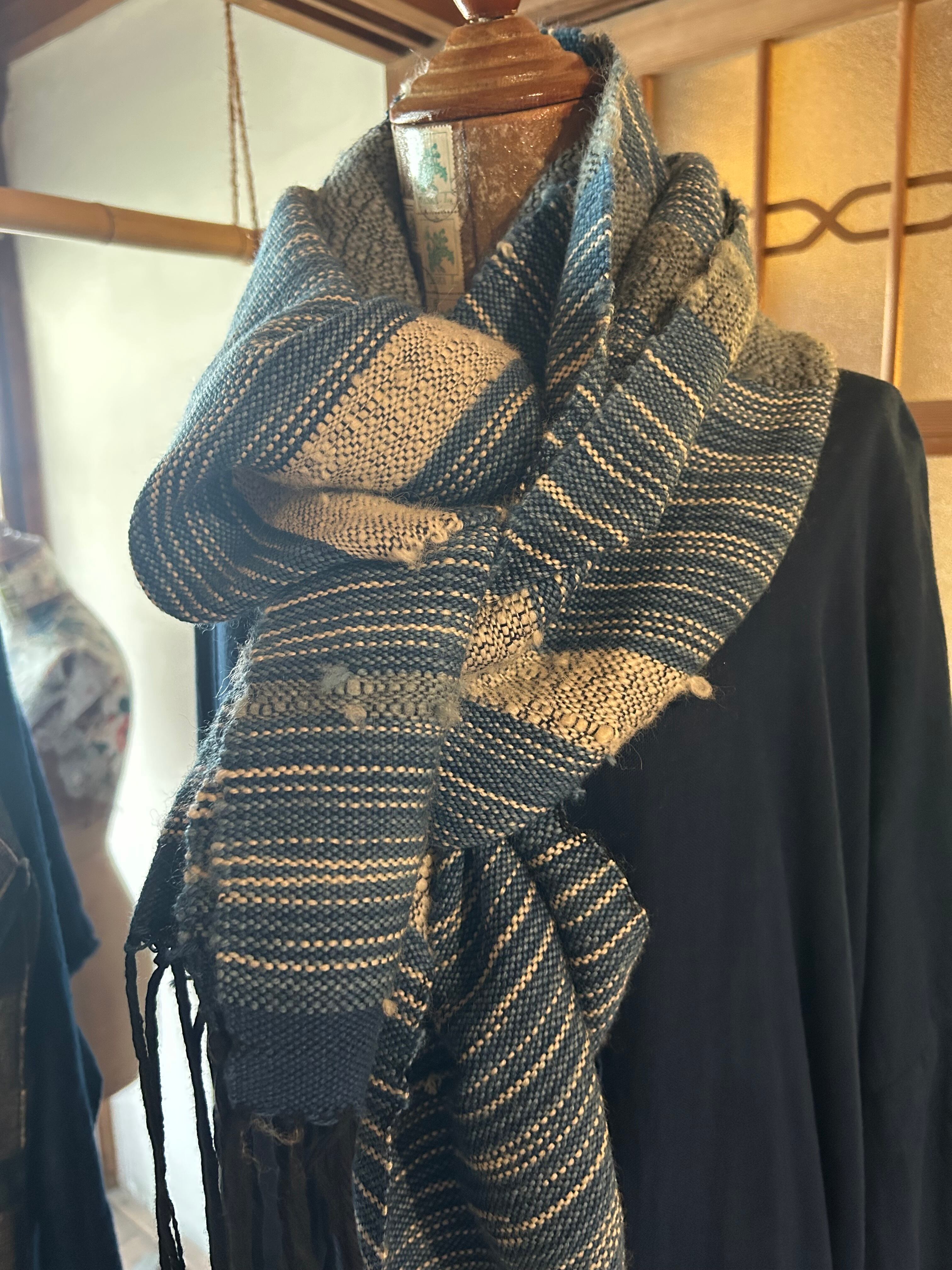 藍染めのグラデーションで染めたウール糸と、藍の生葉で染めた手紡ぎのウール糸で手織りしたショールです。