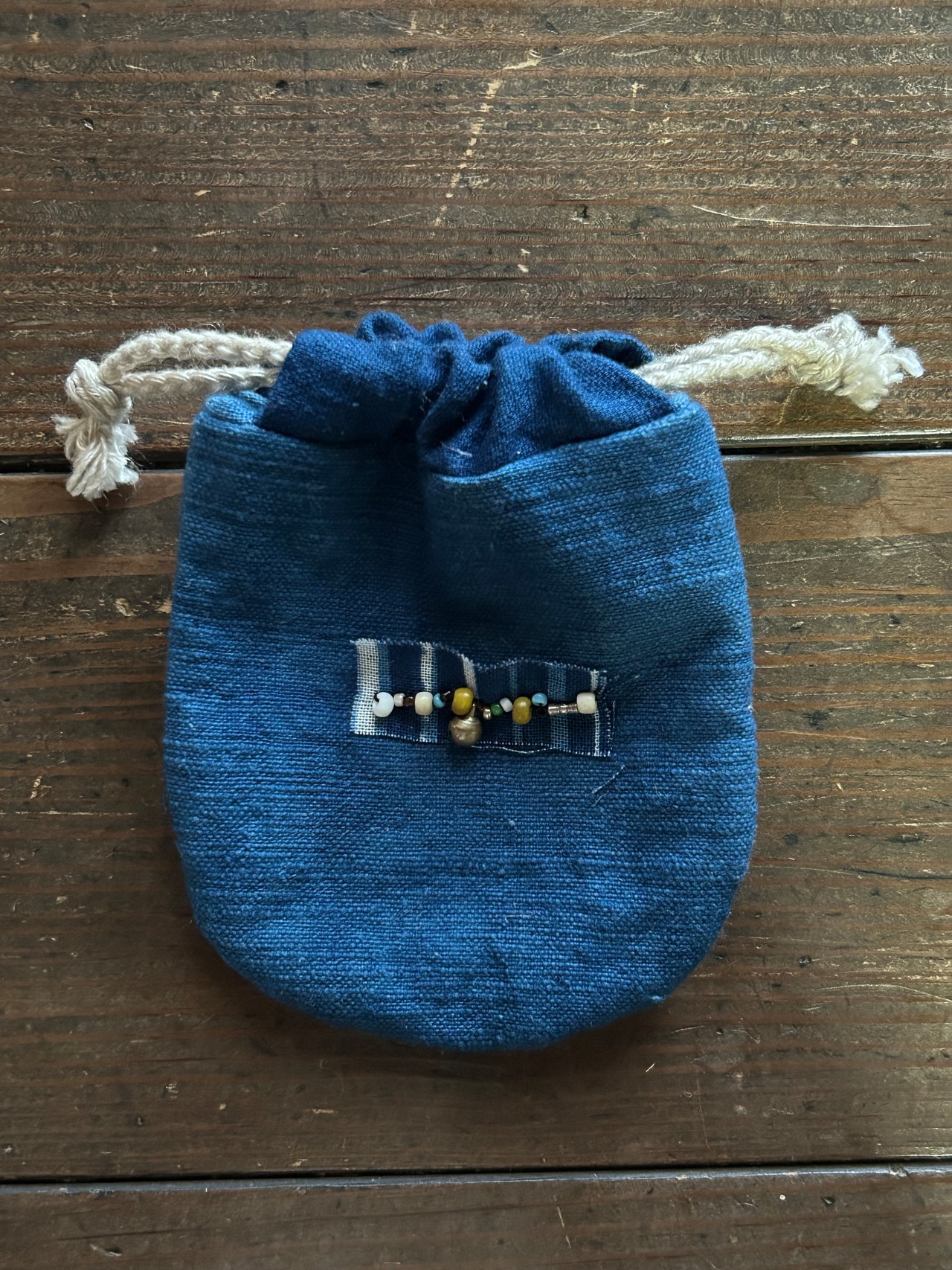 A small amulet bag made of indigo-dyed fabric.